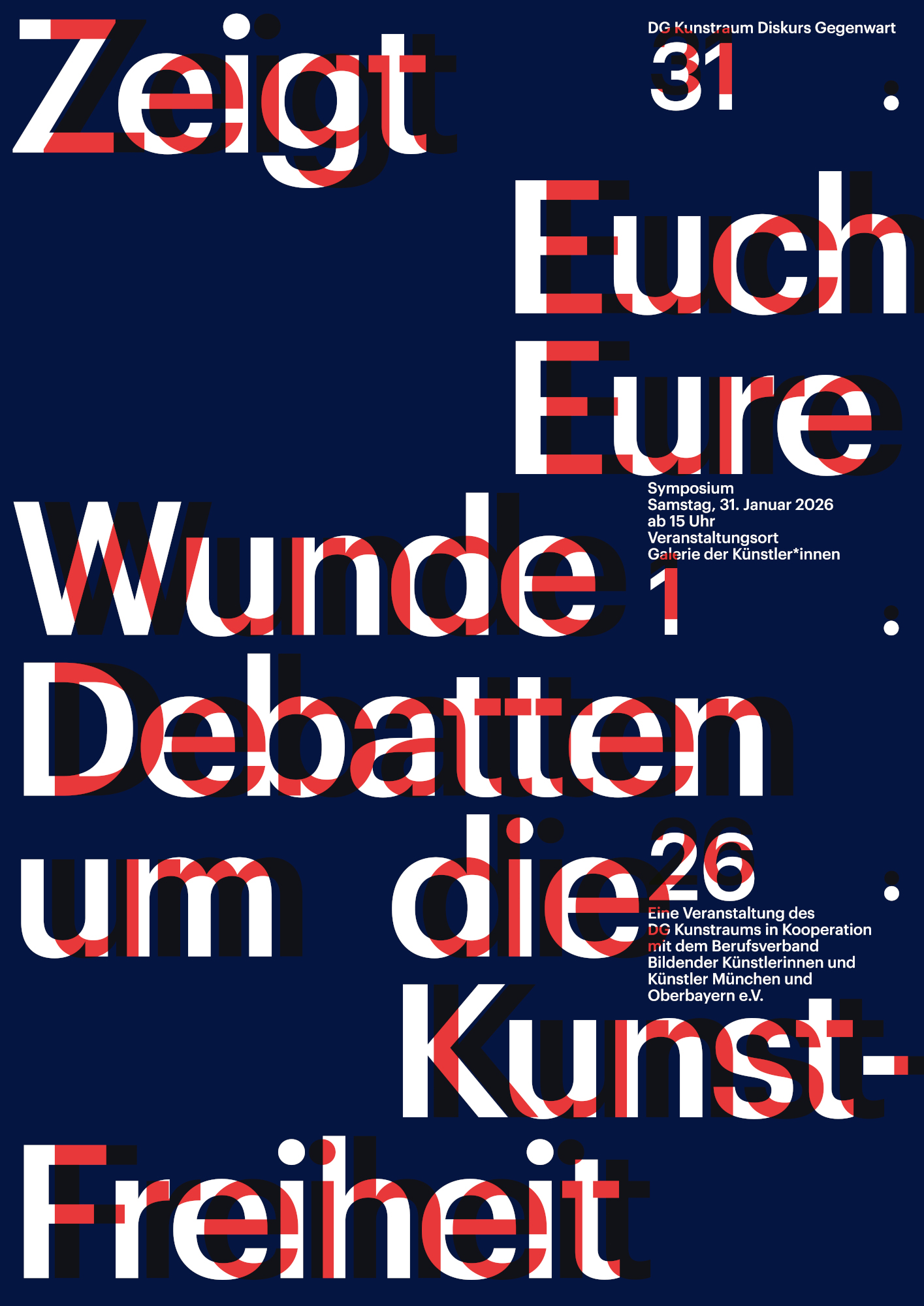 Startseite Schöne Ferien Sommerpause 18. bis 29. August 2025 Mitgliederausstellung Zunder und Zartheit 4. Juli bis 18. September 2025 Zunder und Zartheit Künstlergespräch Dienstag, 16. September 2025, 19 Uhr KatalogräsentationDazwischenseinDienstag, 16. September 2025, 19 Uhr Zunder und Zartheit Finissage mit Musik Udo Schindler & Ardhi Engl Donnerstag, 18. September 2025, 19 Uhr Vorschau Together Forever macht euch die Erde untertan? 10. Oktober bis 18. Dezember 2025 Überblick Ausstellungen 2025 Kunst braucht Freund*innen. Werden Sie Mitglied! Publikation zur Ausstellung ‚Ressource, Research, Reset‘ Architektonische Transformation sakraler Räume T‑Shirt Carsten Fock ‚Be the Reason…‘ Erhältlich im DG Kunstraum DG. 33 bis 55 Eine Ausstellung zur Vereinsgeschichte Filme Plakate Dazwischensein 1–9 + 2024/25 Wanderausstellung Kirche Raum Gegenwart Stationen Doppelpass VII Himmelsstümer Film Newsletter Immer auf dem neuesten Stand DauerausstellungBrigitte Kowanz ‚Sichtlinien des Möglichen‘ JutebeutelDG Kunstraum Diskurs Gegenwart Kirche Raum Gegenwart Künstler*innen denken Kirche neu Filme Doppelpass IV Everything is going to be alright Film Kooperation mit der Hochschule für Musik und Theater Münchenseit 2017 Mit freundlicher Unterstützung des Vereins Ausstellungshaus für christliche Kunst e.V., München.