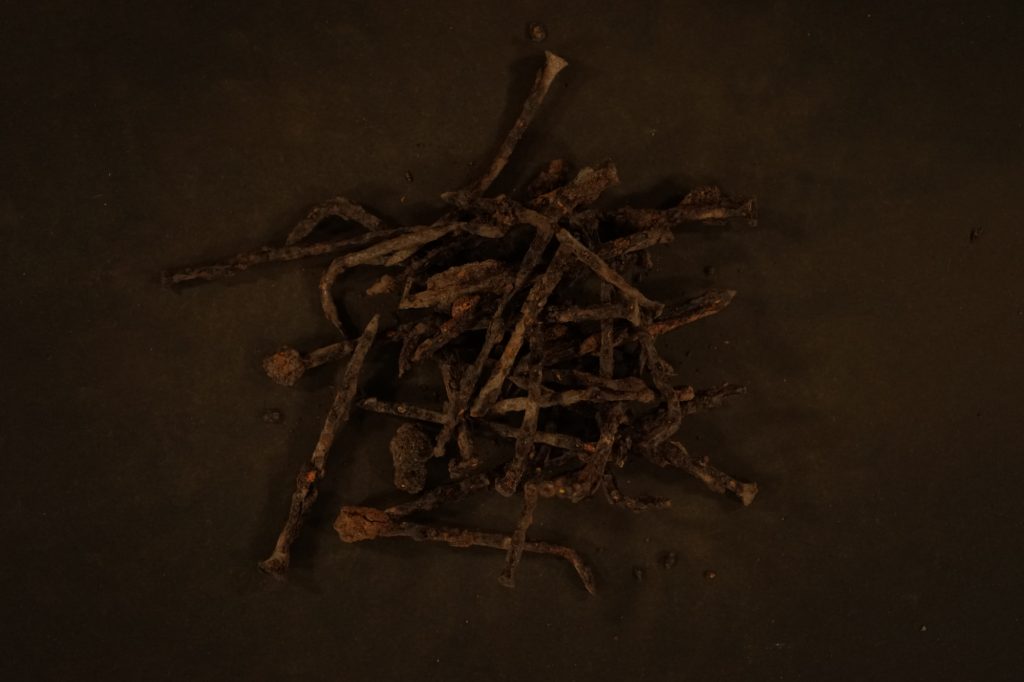 Ausgangspunkt der Installation sind 13.000 verrosteten Nägel, die aus Baracken der Zwangsarbeiter*innen in Berlin-Tempelhof stammen und bei einer archäologischen Grabung gefunden wurden. Sie stehen metaphorisch für die Anonymität der ausgebeuteten Menschen, deren Namen und Geschichten wir nicht kennen, die aber in allen deutschen Städten in der Zeit des Nationalsozialismus eingesetzt wurden. In Würzburg wurden bis zu 9000 Zwangsarbeiter*innen vor allem im Notgefängnis Frieslager tätig. Im Altarraum von Stift Haug entsteht ein Dialog zwischen Vergangenheit und Gegenwart, Kunst und Kirchenraum, der Leiden, Opfer, Schuld und Verantwortung in eine lebendige Erinnerung ruft. Die Besucher*innen sind eingeladen, sich auf den Nägeln zu bewegen.