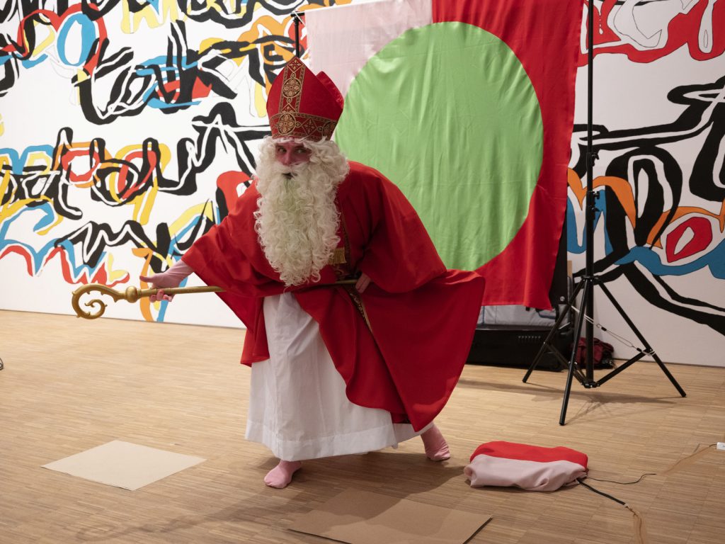 Für die Performance ‚In Search of Humanity‘ schlüpft der Künstler in ein Nikolaus-Kostüm, einem der bekanntesten Heiligen, der sein ererbtes Vermögen zu Lebzeiten unter den Notleidenden verteilte. In einer unbekannten Sprache wendet er sich an sein Publikum und vermittelt sich den Anwesenden trotzdem sehr eindrücklich. Laut Wagner versucht er auf absurde Weise Logik in den für uns manchmal unverständlichen Handlungen von Menschen zu finden. Er nutzt dafür neben Grafiken und Objekten auch ein Plakat, dass ein totes Rind im Schlachthof zeigt. Die Art und und Weise wie der Mensch mit anderen Lebewesen umgeht bringt die Performance Figur in Rage. Hat der Mensch den Auftrag die Erde Untertan zu machen falsch verstanden, da er auch nur ein Teil des Ganzen ist? Damit die komplexen Thematiken nicht nur über Gebärden und Bilder verständlich werden, nutzt der Künstler stellenweise einen grünen Übersetzer-Kopf, der die fremde Sprache für die Zuhörer*innen ins Deutsche und Englische übersetzt.