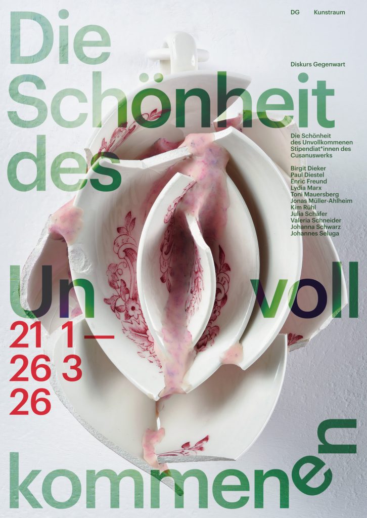 In der Ausstellung ‚Die Schönheit des Unvollkommenen‘ präsentiert der DG Kunstraum Werke von elf Stipendiat*innen des Cusanuswerks. Die Ausstellung widmet sich der Frage, wie sich Schönheit in Formen des Bruchs, der Schlichtheit und der Vergänglichkeit manifestiert. Gezeigt werden künstlerische Positionen, die Heilung und Versehrtheit als Ausgangspunkt nehmen. Heilung bedeutet in diesem Kontext nicht zwangsläufig Wiederherstellung im klassischen Sinn. Sie kann auch darin bestehen, das Unvollkommene anzunehmen.